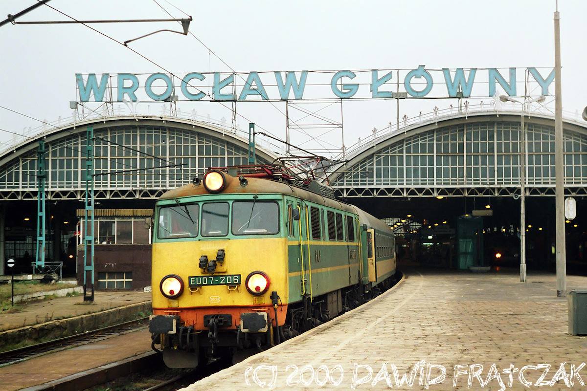 EU07-206 wyjeżdża z Wrocławia Głównego z pospiesznym 66101 "Sudety" z Warszawy Wschodniej do Kudowy i Stronia (22.06.2001)