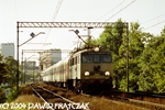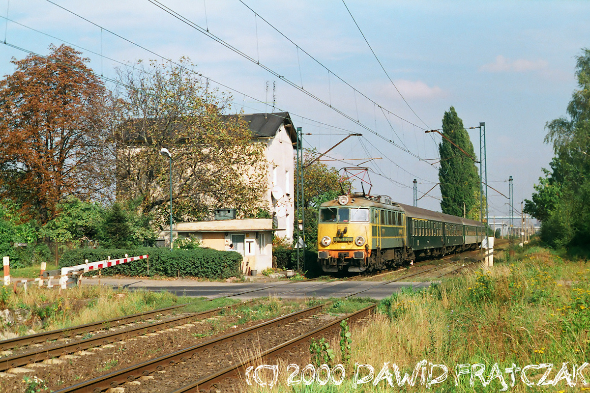 EU07-201 już po naprawie rewizyjnej, przemierza szlak Wrocław Świebodzki - Wrocław Zachodni z pociągiem pospiesznym 66005 do Pragi - przecina przejazd w ciągu ulicy Klecińskiej (01.10.2000)