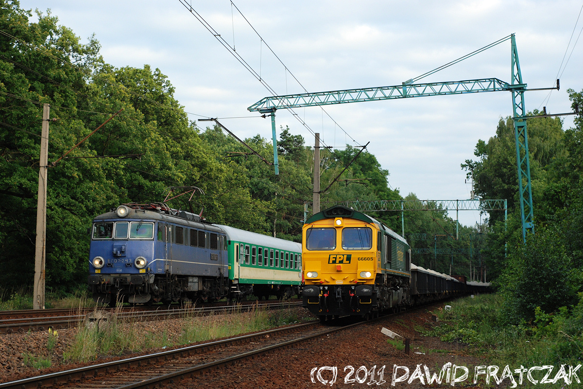 EU07-243 zbliża się do stacji Rudna Gwizdanów prowadząc pociąg 27101 z Zamościa do Zielonej Góry; obok oczekująca na wjazd lokomotywa 66605 FPL (26.06.2011) |