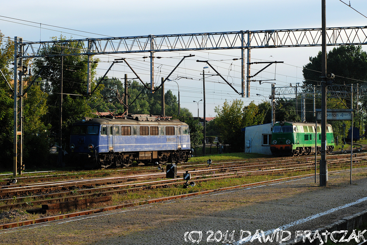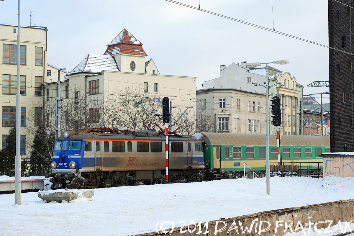 EU07-227 wjeżdża w perony katowickiej stacji z pociągiem TLK 35108/9 Kraków Płaszów - Gdynia Główna (01.01.2011) |