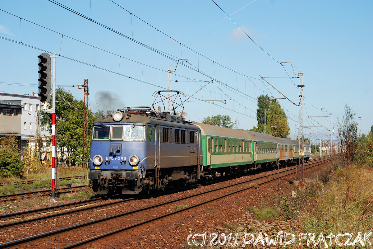 EU07-243 opuszcza Piotrków Trybunalski prowadząc pociąg pospieszny 54100 z Bydgoszczy do Katowic (26.09.2011) |