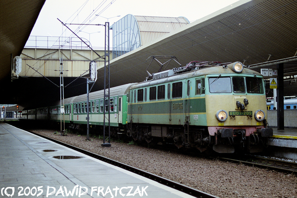 EU07-205 w Krakowie Głownym z pociągiem 13101 "Reymont" z Łodzi Fabrycznej do Krakowa Płaszowa (11.06.2005)
