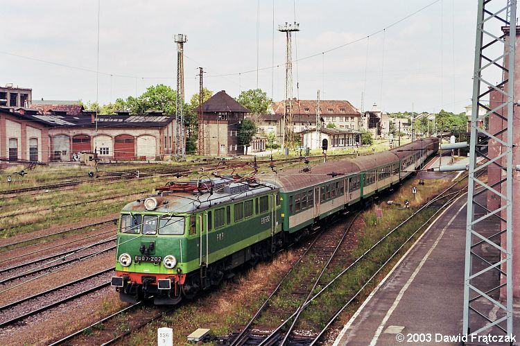 EU07-202 z pociągiem 516 Zgorzelec - Wrocław Gł., podczas postoju w Legnicy (00.06.2001) |