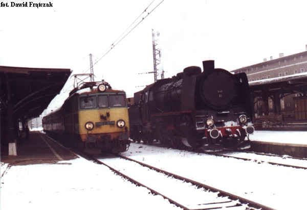 EU07-206 wtacza się w perony jaworzyńskiej stacji z pociągiem turystycznym nr 22705 relacji Wrocław Gł. - Wałbrzych Gł. - Kłodzko Gł. - Wrocław Gł. Obok - Ty45-20, który pociągnie pociąg dalej (18.03.2001)