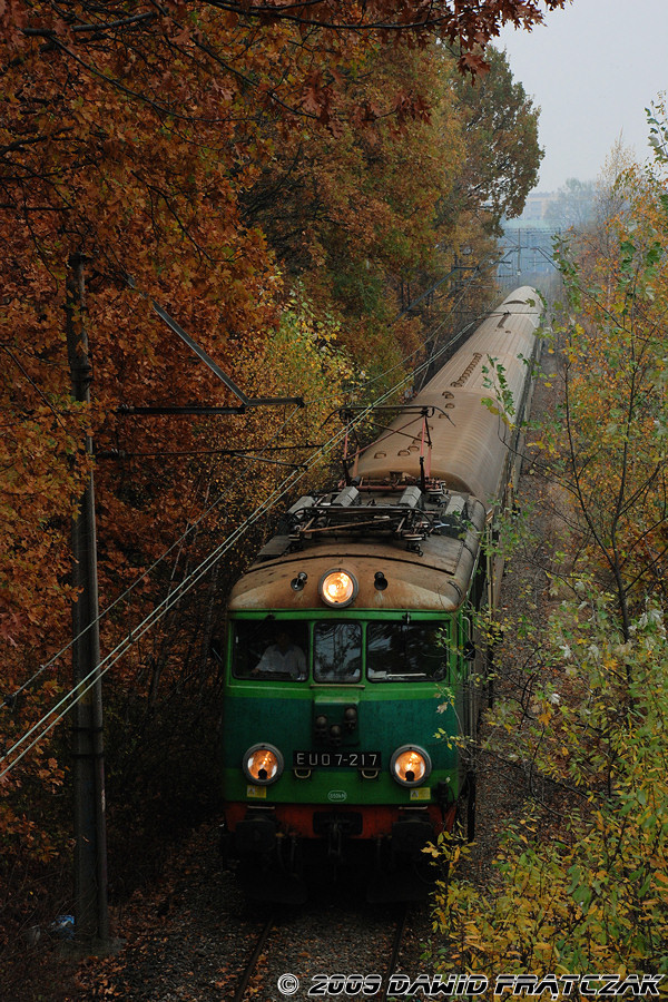 EU07-217 pomiędzy podg Grabiszyn a stacją Wrocław Gądów. Pociąg z Wrocławia Głównego kursował objazdem do Gądowa, następnie - po zmnianie czoła - do Popowic na swoja stałą trasę. (07.11.2009) |