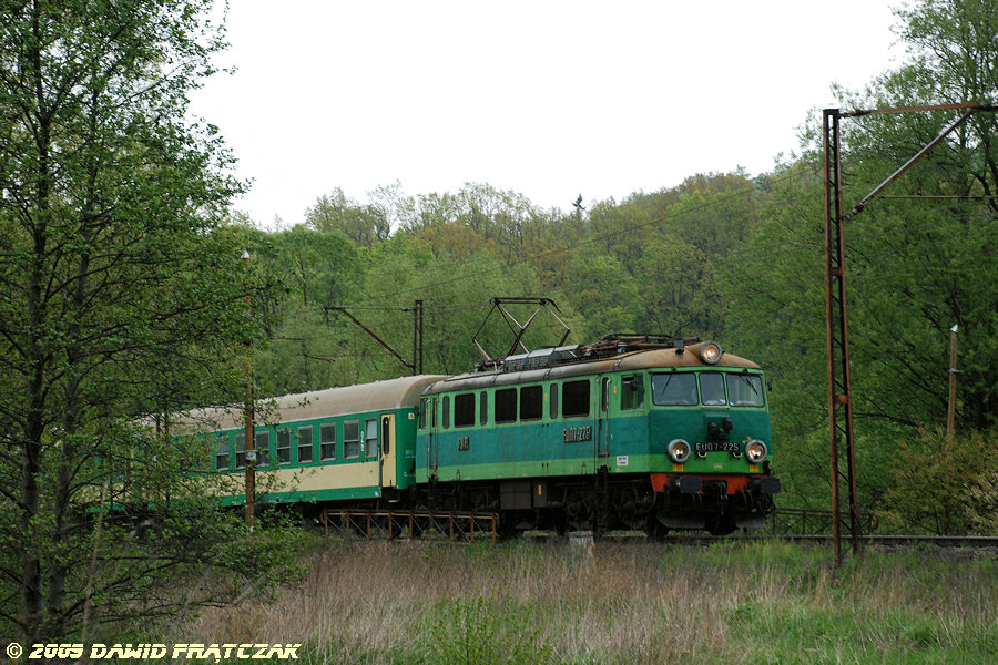 EU07-225 z pociągiem 7623 z Poznania do Szklarskiej Poręby Górnej, pomiędzy Świebodzicami, a Wałbrzychem Szczawienkiem (04.05.2009) |
