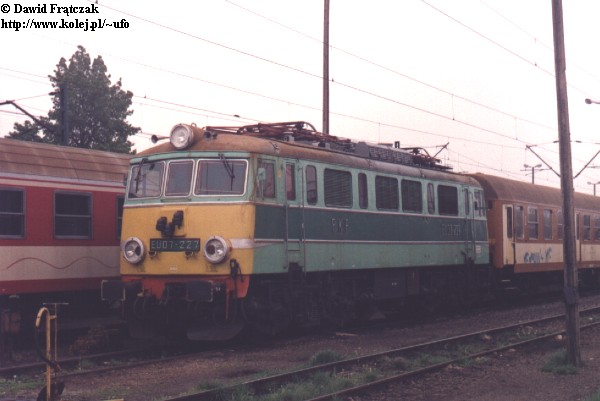 EU07-227 na torach postojowych stacji Wrocław Główny z pociągiem do Katowic (08.05.2001)