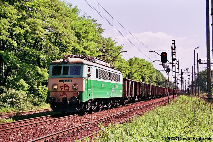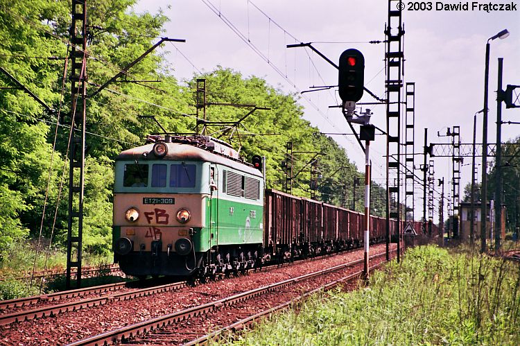 ET21-309 z pociągiem towarowym mija posterunek Brzeszcze Kopalnia (14.06.2003) |